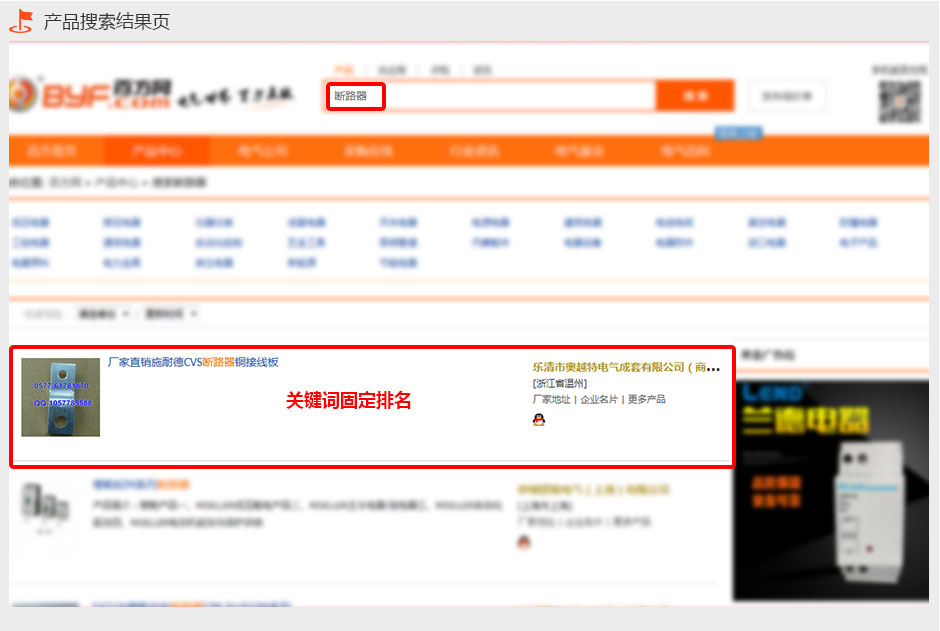 “關鍵詞固定排名”服務以供應產品信息的形式展現,關鍵詞固定排名共有5個位置,按照價格高低方式體現,價格最高的位于第一位,價格最低的位于第五位,供應產品信息以不同底色和其他信息區分開。